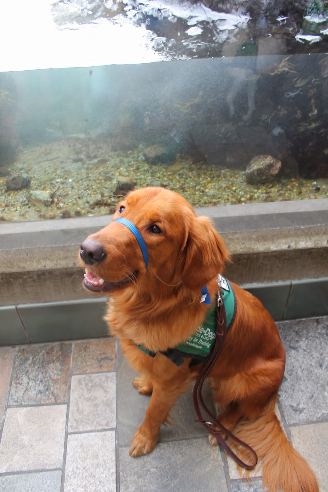 This is coming late but it was such a fun trip I figured better late than never. On January 31 Pinnacle and I traveled up to Monterey to meet up with some other raisers. There were 9 pups and 12 people on this trip. We all met up in a parking lot then made the walk to the Monterey Aquarium. While walking Pinnacle got to work on ignoring tons of distractions and also not being in front of the pack of dogs. He really likes to be in front so I have been working on him slowing down and not always being in front. He was a good boy and ignored all distractions. He did pull some to try to get into the front but once he realized that wasn't going to happen he stopped pulling. I'm sure we were quite the sight walking down the street with our big group of pups. Once inside the aquarium we all walked around, practiced commands, and took pictures. Every single pup was well behaved. People kept telling us how well behaved our pups were and also kept wanting to take pictures of all our pups. I would say my favorite part was when we went to see the penguins. While there I took Pinnacle up to see the penguins and he ended up having a staring contest with one of the penguins. Well this one penguin decided to play with Pinnacle. So while Pinnacle was sitting there being good the penguin came up and spit water at the glass in Pinnacle's direction. Everyone had a good laugh.